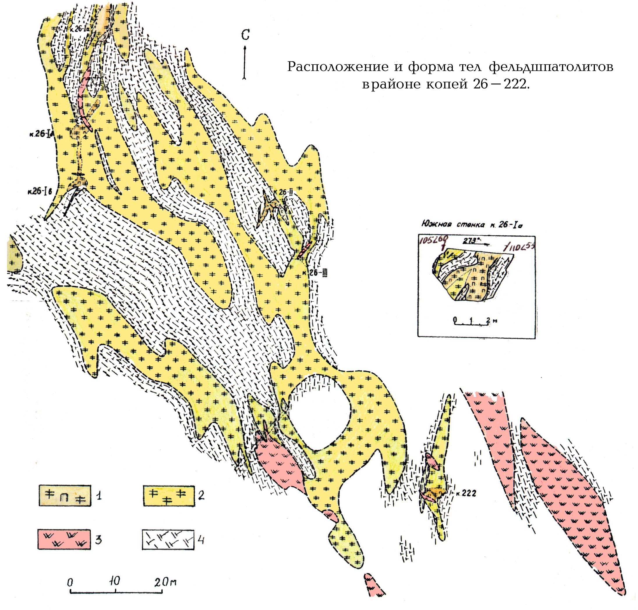1 - пегматиты двуполевошпатовые, 2 - фельдшпатолиты, 3 - пироксен-кварц-полевошпатовые жилы, 4 - биотитовые фениты. Документация В.И. Поповой.