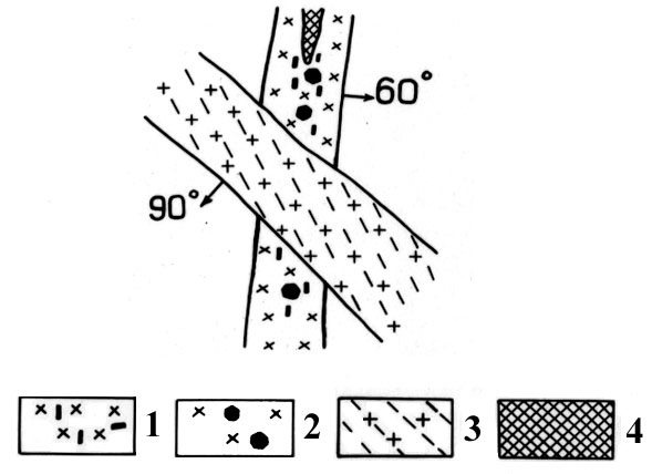 1 - полевошпатовый пегматит с ортитом, 2 - полевошпатовый пегматит с биотитом, 3 - кварц-полевошпатовый пегматит с пироксеном и амфиболом, 4 - кварц (по И. Е. Мальцеву)