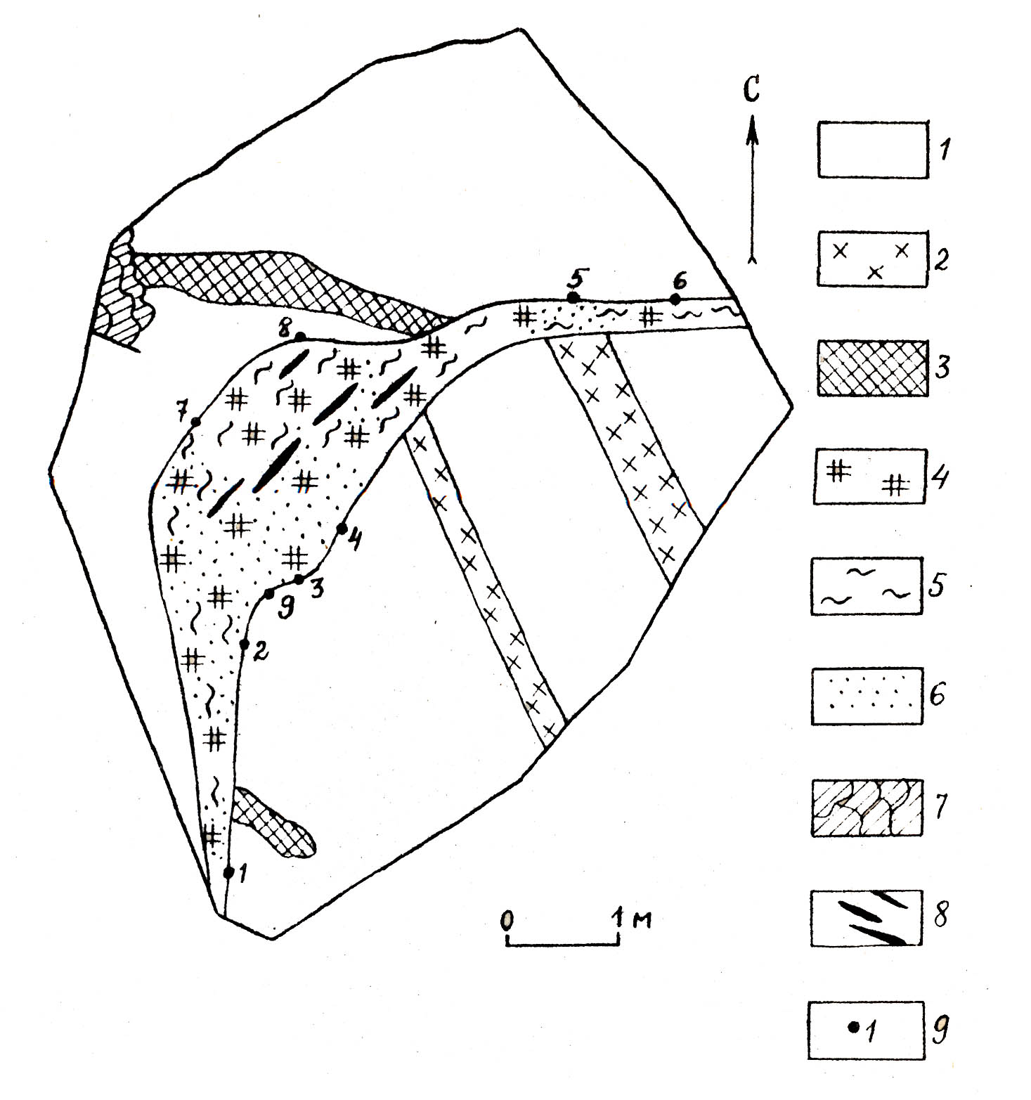 1 - вмещающие породы (гнейсово-амфиболитовая толща), 2 - фельдшпатоиды, 3 - кварцевые жилы, 4 - амазонит, 5 - следы милонитизации, 6 - альбит, 7 - древний гранитный пегматит, 8 - кварцевые линзы, точки замеров элементов залегания жилы: 1. 300 / 80. 2. 320 / 60, 3. 350 / 70, 4. 310 / 60, 5. 300 / 50, 6. 320 / 60, 7. 300 / 70, 8. 330 / 70, 9. 300 / 90. План копи