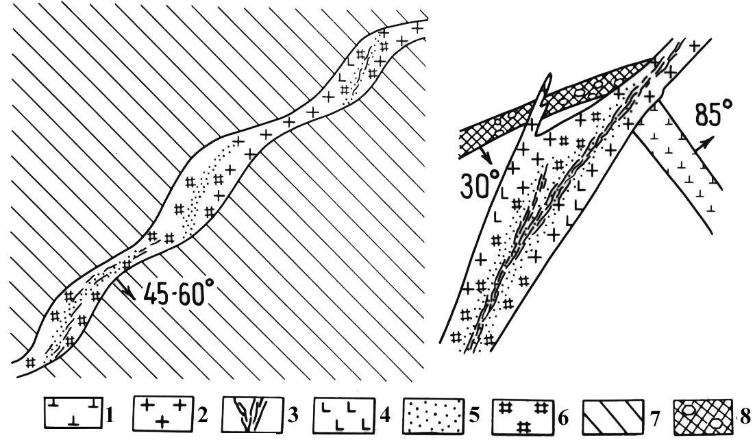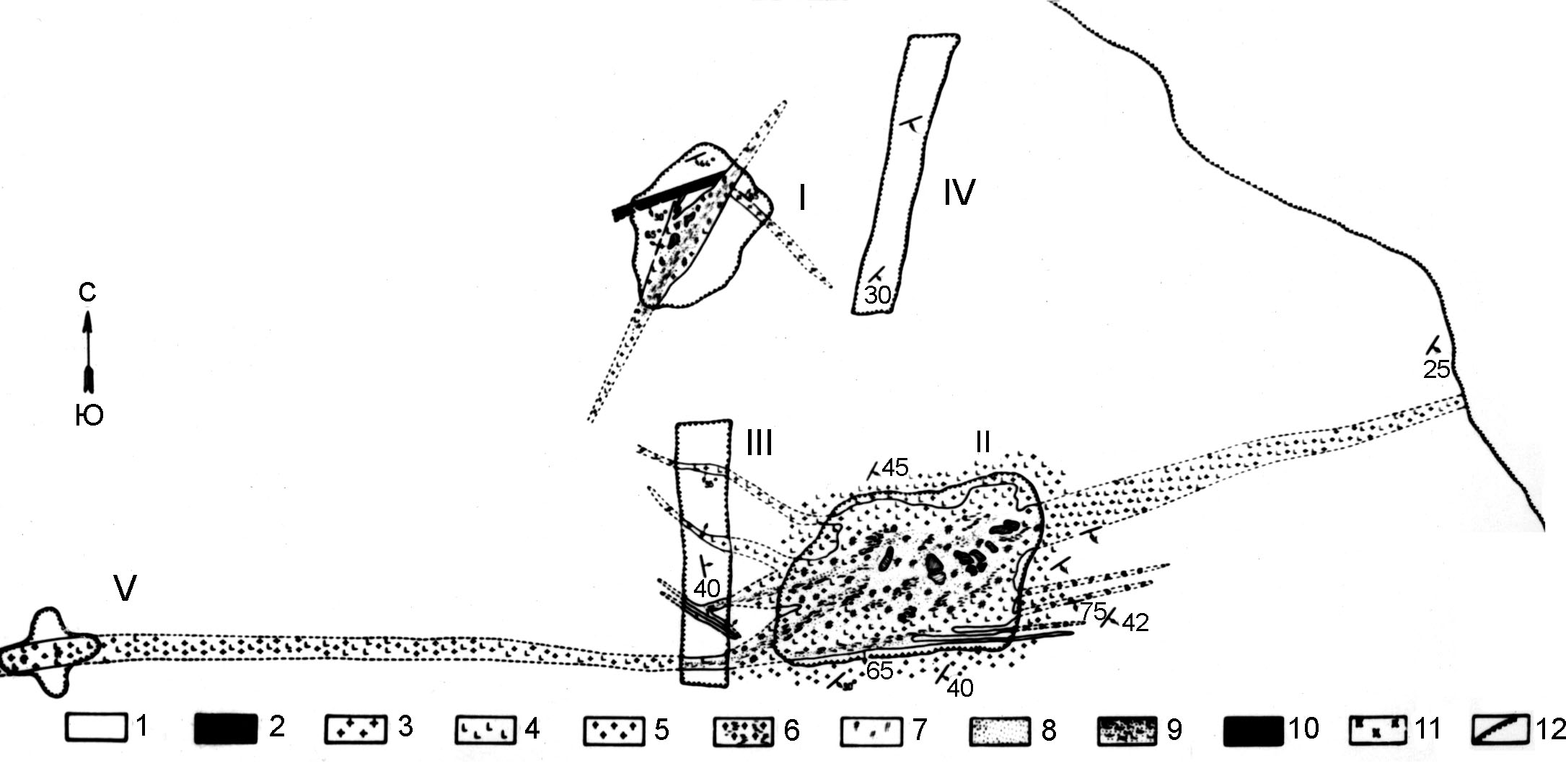 1 - сиениты, 2 - гранитный пегматит, 3 - альбитовый милонит, 4 - графический пегматит, 5 - сахаровидный альбит, 7 - амфиболиты и гранито-гнейсы, 8 - кварцевые жилы с идиоморфным микроклином. Кварц-полевошпатовый пегматит с амазонитом (широтные и субширотные жилы)